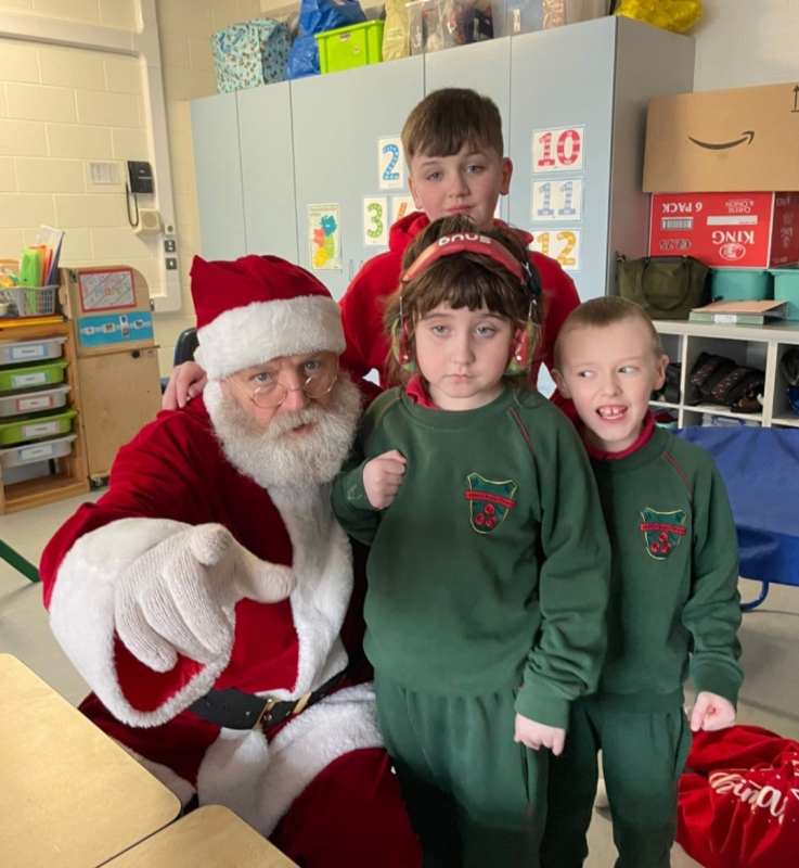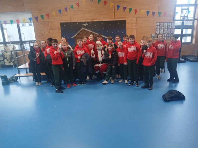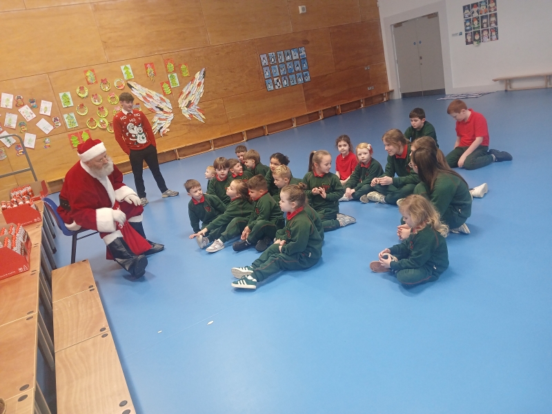 Tháinig Daidí na Nollag ar chuairt go Gaelscoil Bhaile Munna inniu. Labhair sé le gach rang. Chan na páistí amhráin dóibh agus chuir siad go leor ceisteanna air. Bhí na páistí an sásta leia an seacláid a thug sé dóibh.