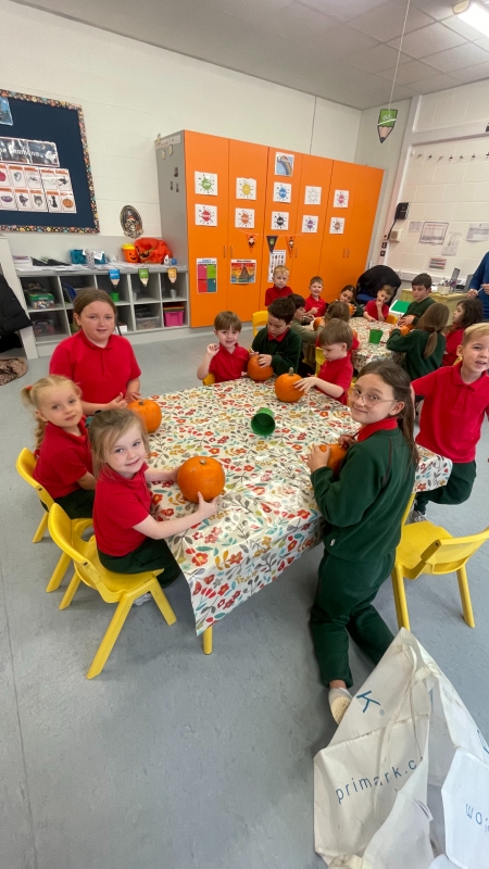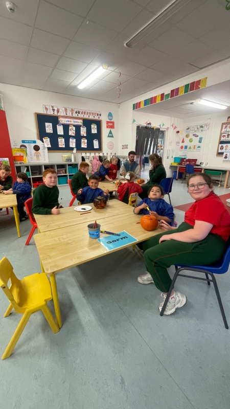 Tháinig ár gcairde ó rang a 5 síos chun cabhrú leis na Naíonáin Shóisearacha lena n-ealaín Oíche Shamhna! D’oibrigh siad le chéile ag péinteáil puimcíní ildaite, ag gáire agus ag léiriú cairdis agus cruthaitheachta iontach.